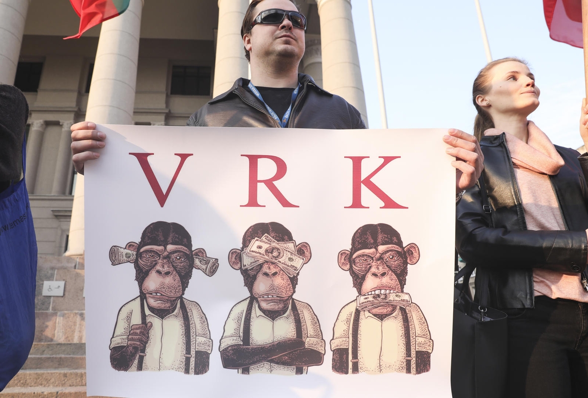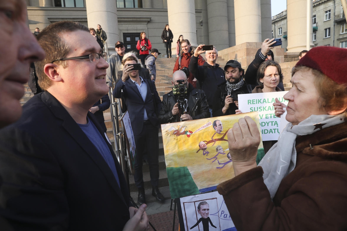 Taip pat protestuotojai klausimais apipylė ir kandidato į prezidentus Sauliaus Skvernelio patarėją Skirmantą Malinauską. Klausimų buvo tiek, kad S. Malinauskas nespėjo į juos atsakinėti.