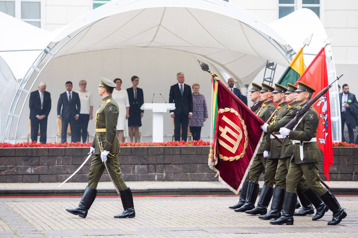 Kreipdamasis į aikštėje tuo metu buvusius Europos Vadovų Tarybos pirmininką Charles‘į Michelį (Šarlį Mišelį) ir Ukrainos prezidentą Volodymyrą Zelenskį G. Nausėda teigė, kad jie dar kartą primena apie Lietuvos priklausomybę Europos tautų šeimai, kaip ir daugelio amžių patikrintą Lietuvos ir Ukrainos draugystę bei bendrystę.