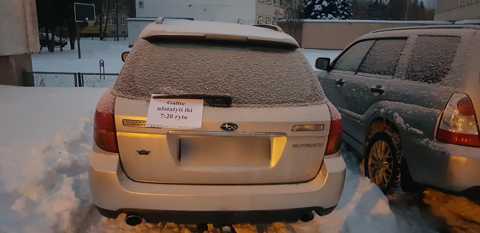Socialiniame tinkle „Facebook“ plinta nuotraukos, kuriose matyti automobiliai, su ant galinių langų uždėtais lapais, prilaikomais valytuvų.