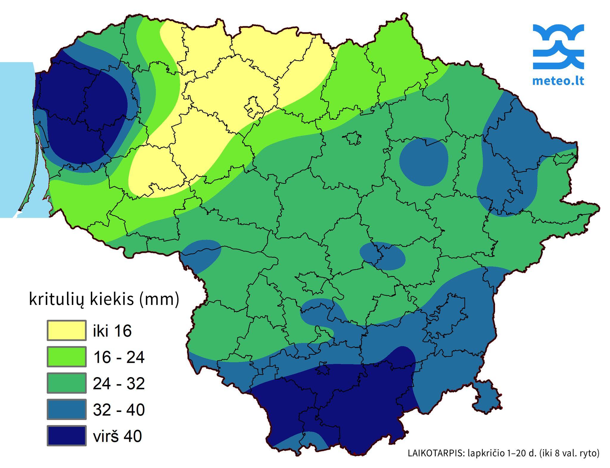 Daugiausia kritulių lapkričio 1–20 d. (iki 8 val. ryto) iškrito pietiniuose ir rytiniuose rajonuose: