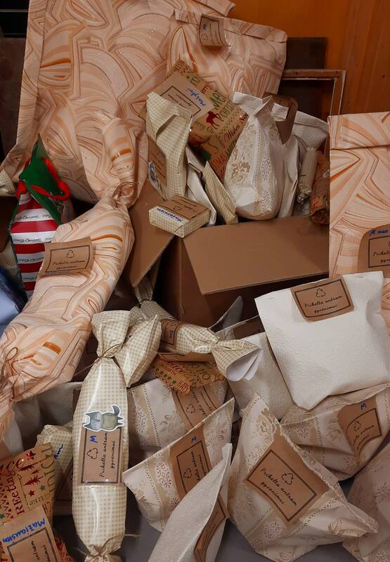 Iš pradžių manė, kad tiks ir laikraščiai, bet rezultatas neatrodė šventiškas. Tada ji sugalvojo, kad vietoj dovanų popieriaus galima panaudoti tapetų likučius. Kai prašymu pasidalino feisbuke, žmonės pridovanojo visą glėbį senų, jau nebenaudojamų tapetų. „Kai kurie blizgėjo kaip tikras kalėdinis popierius“, – pasakoja Jurga, pradėjusi į juos pakuoti žaisliukus.
