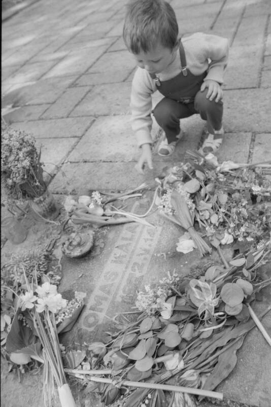 Žaizda: berniukas deda gėles ant paminklinio akmens, žyminčio R. Kalantos žūties vietą, 1993 m. / A. Žižiūno / Lietuvos centrinio valstybės archyvo nuotr.