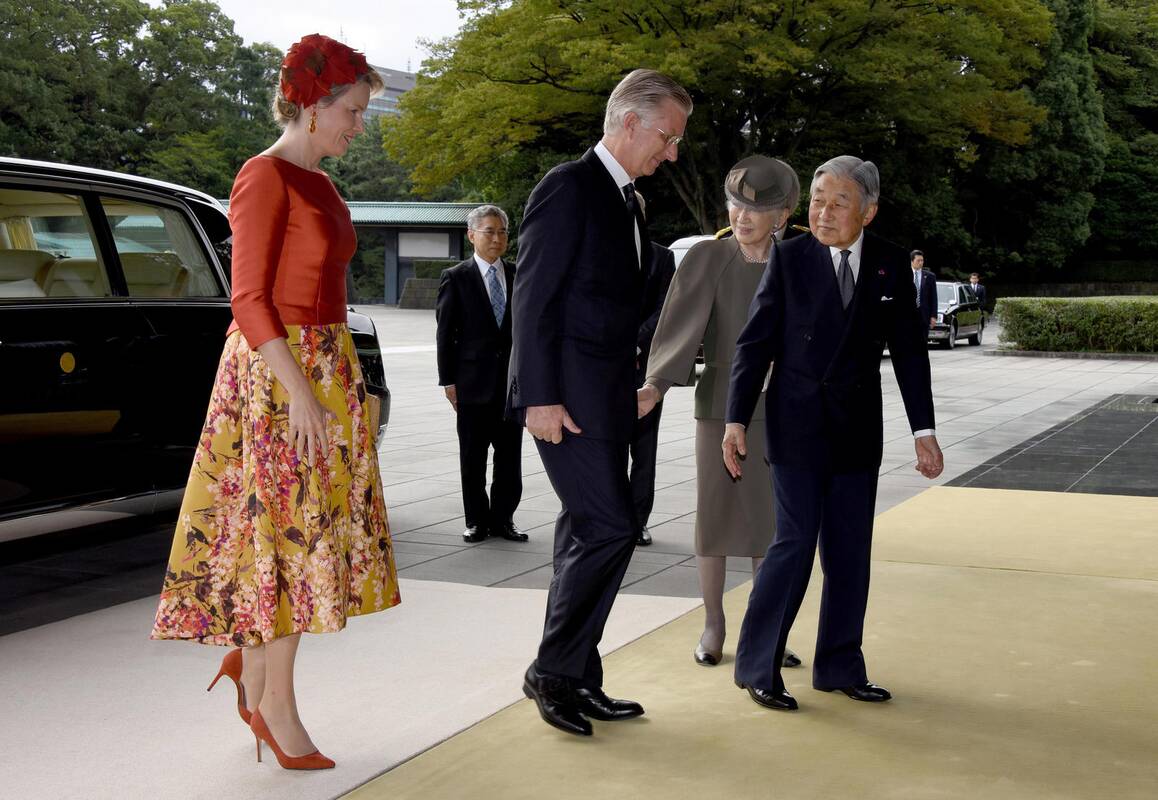 Antradienį Belgijos karališkąją porą per ceremoniją po atviru dangumi imperatoriškųjų rūmų teritorijoje sutiko Japonijos imperatorius Akihito (Akihitas) ir imperatorienė Michiko (Mičiko).