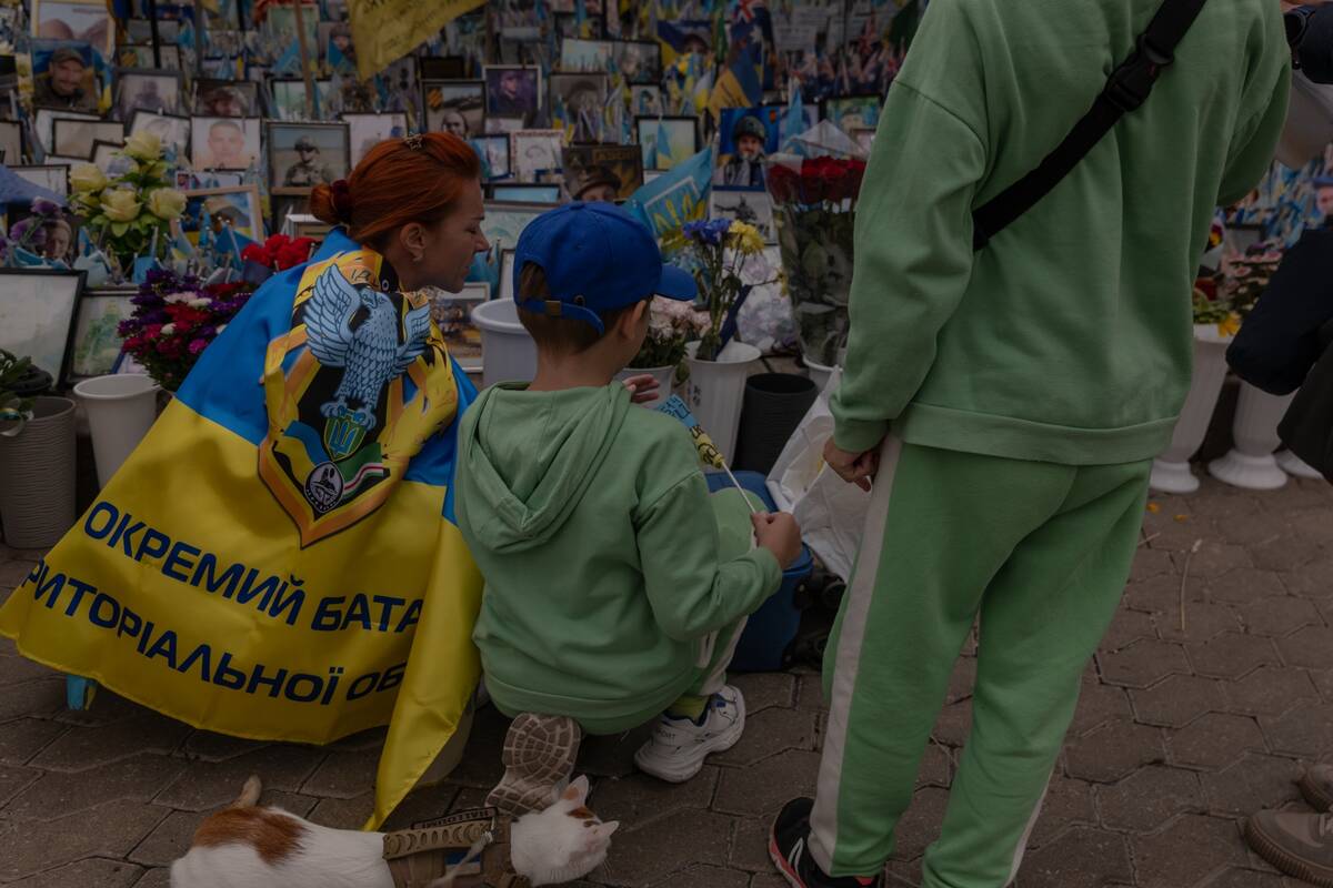 Kyjivo centrinėje – Maidano aikštėje – įrengtas lauko memorialas, kuriame išdėliotos Ukrainos vėliavos ir žuvusiųjų nuotraukos, kurių skaičius su kiekviena Rusijos ataka vis didėja.