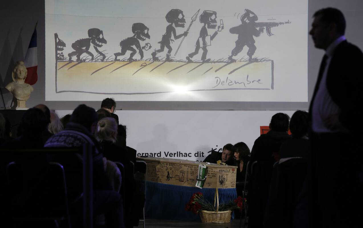 80-metis Georges'as Wolinski (Žoržas Volinskis) ir 57 metų Bernard'as Verlhacas (Bernaras Verlakas), žinomas Tignous (Tinju) slapyvardžiu, bus palaidoti per privačias šeimos ceremonijas po to, kai praeitą savaitę buvo nušauti dviejų brolių islamistų ataką, dėl kurios atsakomybę prisiėmė tarptautinis teroristų tinklas „al Qaeda“.