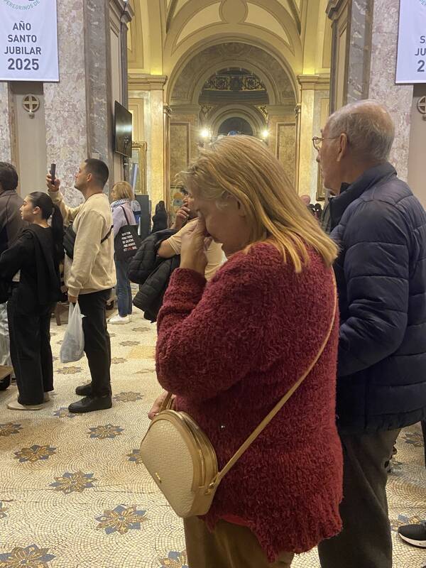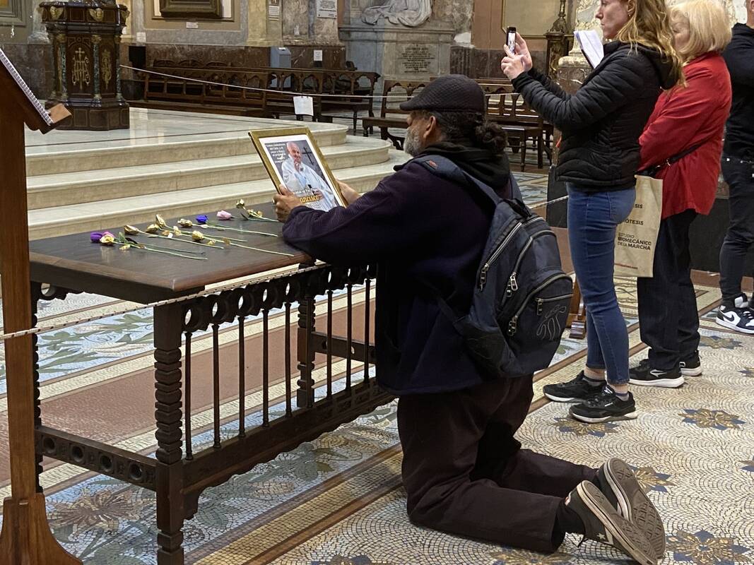 Buenos Airių katedra nuo ankstyvo ryto pilna gedėtojų. Ne vienas jų neslepia ašarų. Visa bažnyčia vieningai pusbalsiu kartoja maldas, netrukus laikomos šv. Mišios už popiežių. Popiežius Pranciškaus portretą altoriuje supa baltos gėlės. Ant kelių klūpantis maldininkas iš rankų nepaleidžia savo atsinešto popiežiaus portreto.