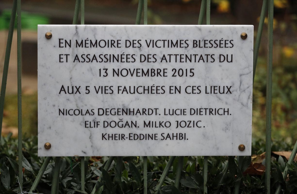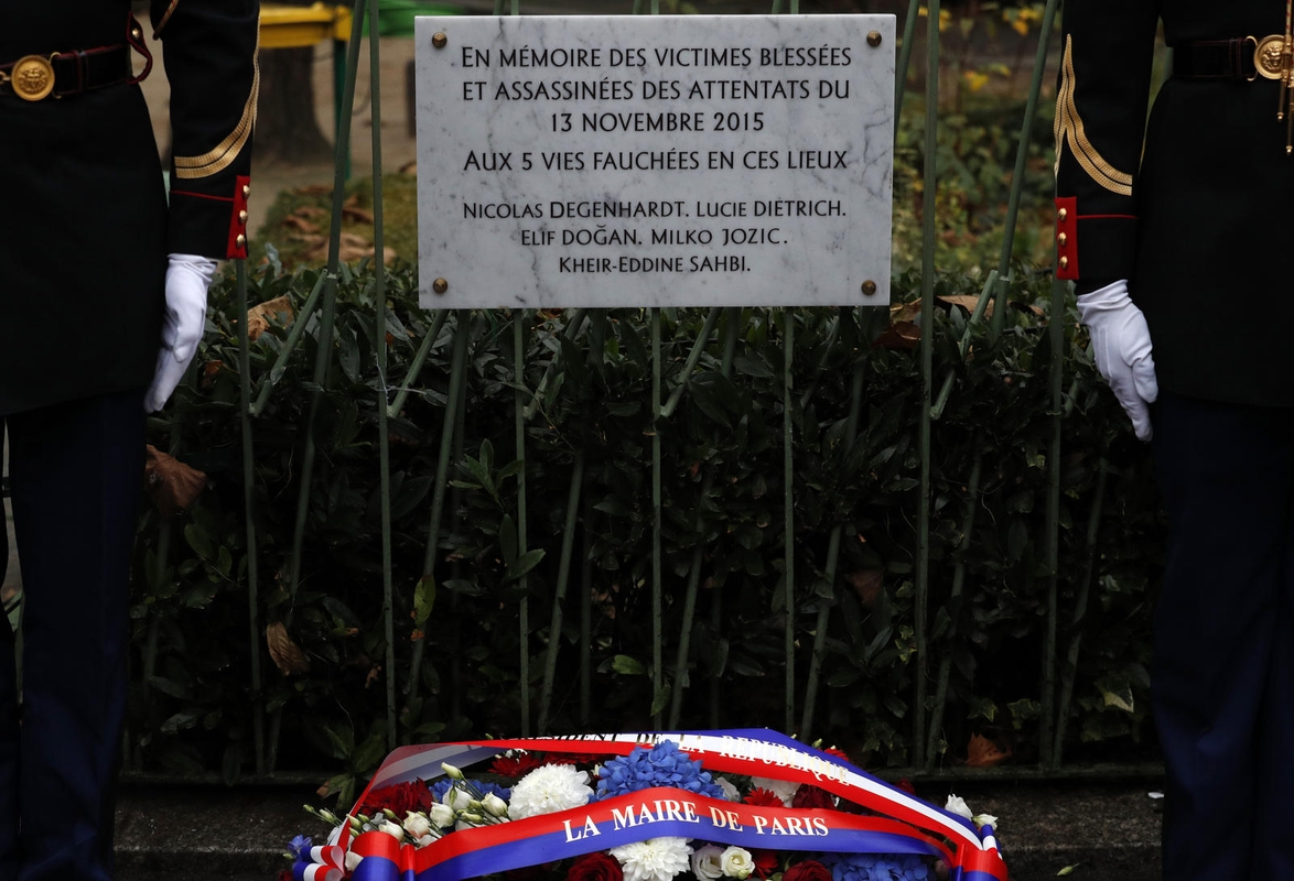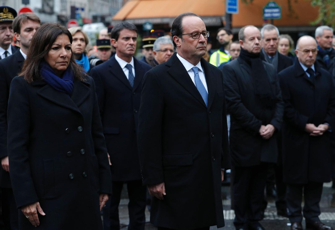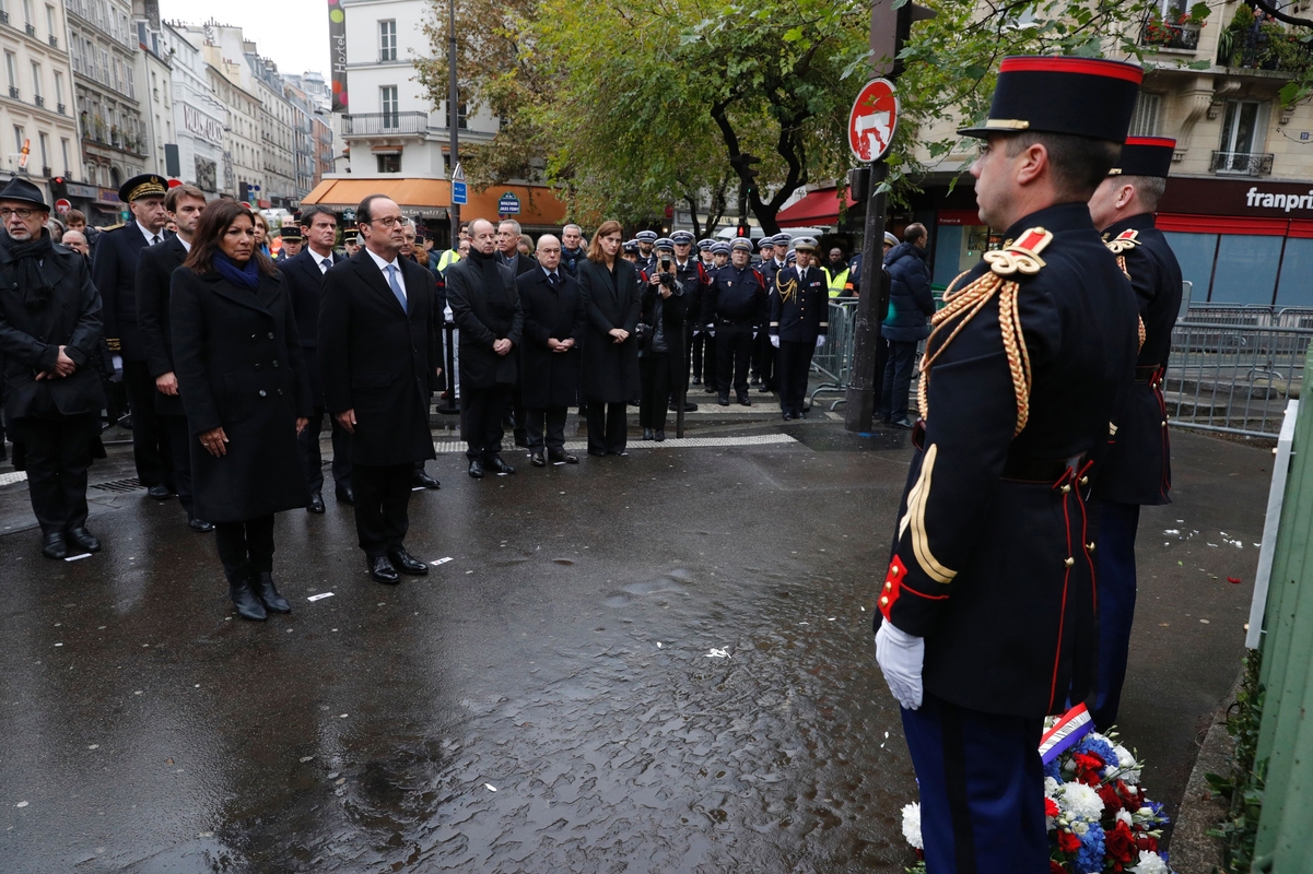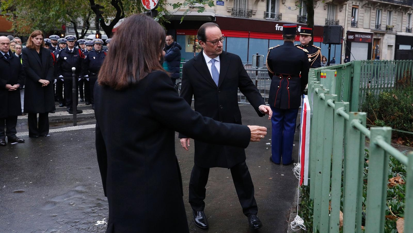 F. Hollande'as ir Paryžiaus merė Anne Hidalgo (An Hidalgo) dalyvauja atidengiant paminklines lentas prie madingų barų ir restoranų, kuriuose prieš metus penktadienį vakare švenčiančius žmones kulkomis suvarpė judėjimo „Islamo valstybė“ kareivos.