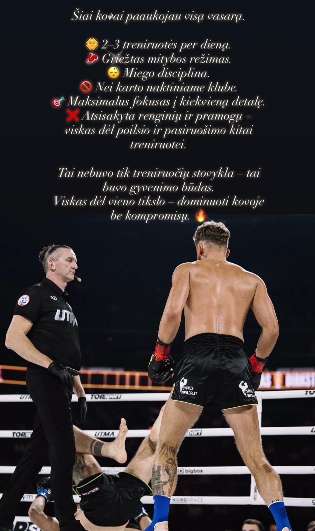 „Šiai kovai paaukojau visą vasarą. 2-3 treniruotės per dieną, griežtas mitybos režimas, miego disciplina, nė karto naktiniame klube, maksimalus fokusas į kiekvieną detalę. Atsisakyta renginių ir pramogų – viskas dėl poilsio ir pasiruošimo kitai treniruotei. Tai nebuvo tik treniruočių stovykla – tai buvo gyvenimo būdas. Viskas dėl vieno tikslo – dominuoti kovoje be kompromisų“, – rašė kovotojas.