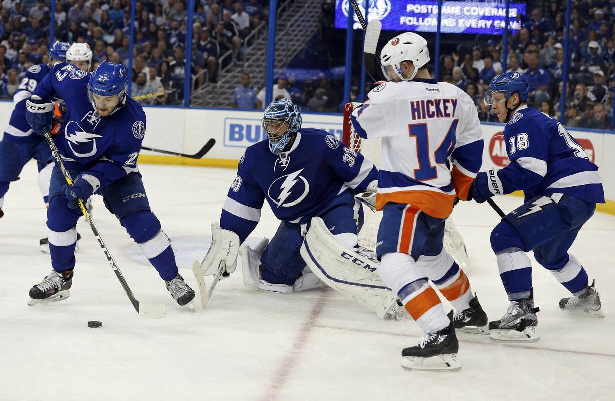 Pirmąjį pusfinalio mačą Tampos ekipa namuose pralaimėjo 3:5, o antrajame iškovojo pergalę 4:1. Trečiosiose rungtynėse Niujorke „Lightning“ ekipą sėkmė lydėjo po pratęsimo 5:4, o ketvirtajame mače pergalė iškovota minimalia persvara – 2:1.
