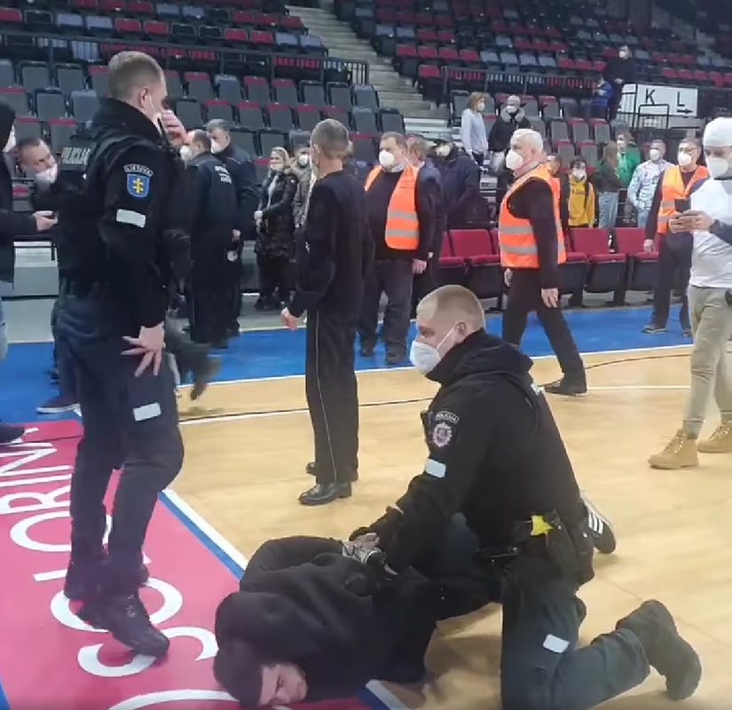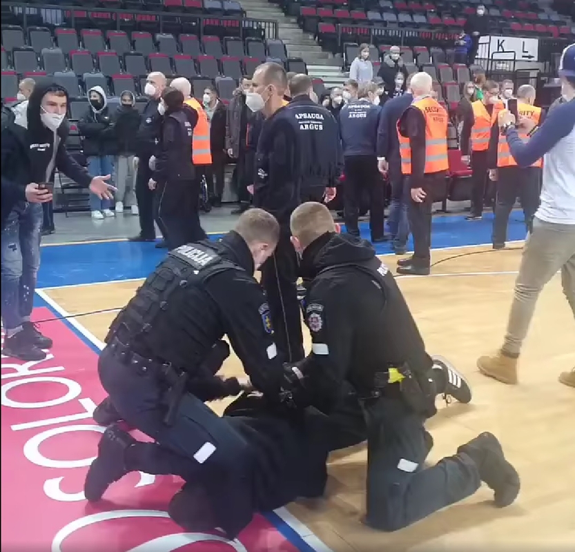 Vienas iš „Žalgirio“ sirgalių tribūnoje buvusių žmonių bandė žengti ant parketo, kuomet aikštėje dar vyko krepšininkų pakalbinimas televizijai, o policija jį sustabdė.