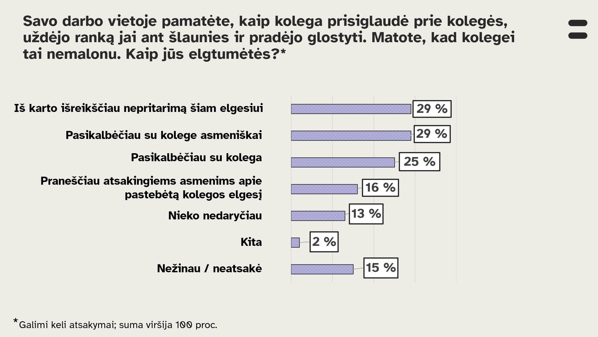 Apklausos dalyviams (-ėms) buvo užduotas toks klausimas: „Savo darbo vietoje pamatėte, kaip kolega prisiglaudė prie kolegės, uždėjo ranką jai ant šlaunies ir pradėjo glostyti. Matote, kad kolegei tai nemalonu. Kaip jūs elgtumėtės?“. 29 proc. respondentų (-čių) teigė, kad pasisakytų tam nepritariantys. Beveik tokia pat dalis nurodė, kad pasikalbėtų su nukentėjusia kolege (29 proc.) arba priekabiavusiu vyru (25 proc.).