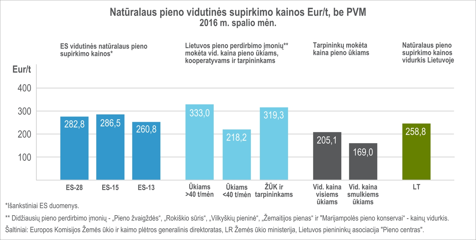 Sudėjus stambių, vidutinių bei smulkiausių pieno ūkių bei kooperatyvų gaunamas kainas, spalį vidutinė natūralaus (4,41 proc. riebumo ir 3,54 proc. baltymingumo) pieno supirkimo kaina buvo 258,8 eurai už toną. Per spalį vidutinė natūralaus pieno supirkimo kaina padidėjo 22,2 proc.