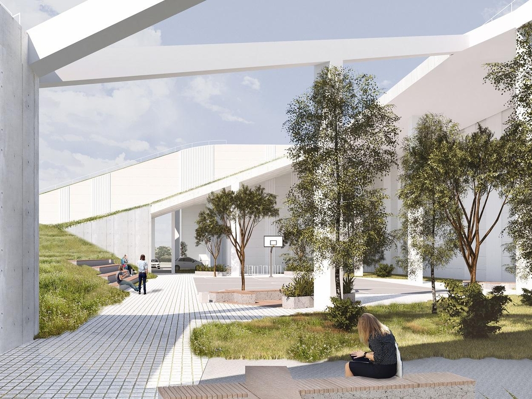 Pagal projektą, žvelgiant nuo pagrindinio kelio logistikos centro pastatas dėl specialiai suformuotos apželdintos „kalvos“ vizualiai kurs plokščiakalnio įspūdį. Po šia žaliuojančia nuožulnia konstrukcija bus įrengta automobilių stovėjimo aikštelė ir rekreacinė zona su krepšinio aikštele.