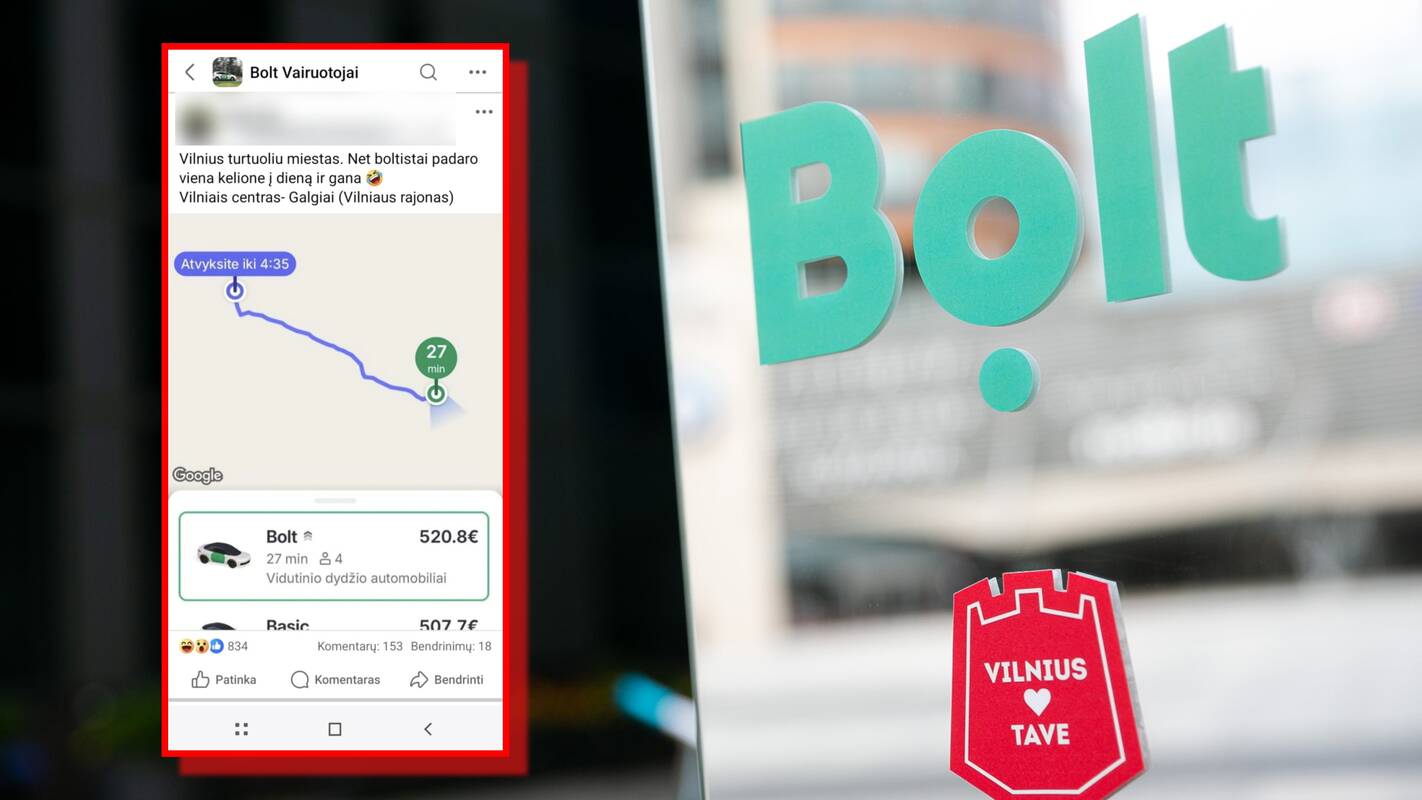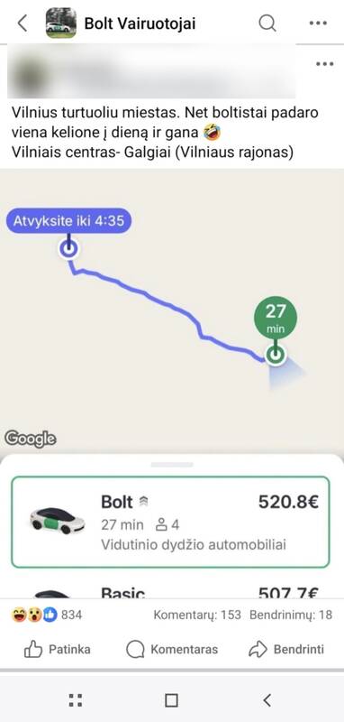 „Vilnius – turtuolių miestas. Net „boltistai“ įvykdo vieną kelionę per dieną ir gana“, – rašė fiksuotais ekrano vaizdais, kaip teigta, iš kliento „Bolt“ programėlės socialinio tinklo grupėje „Bolt vairuotojai“ pasidalijęs vyras.