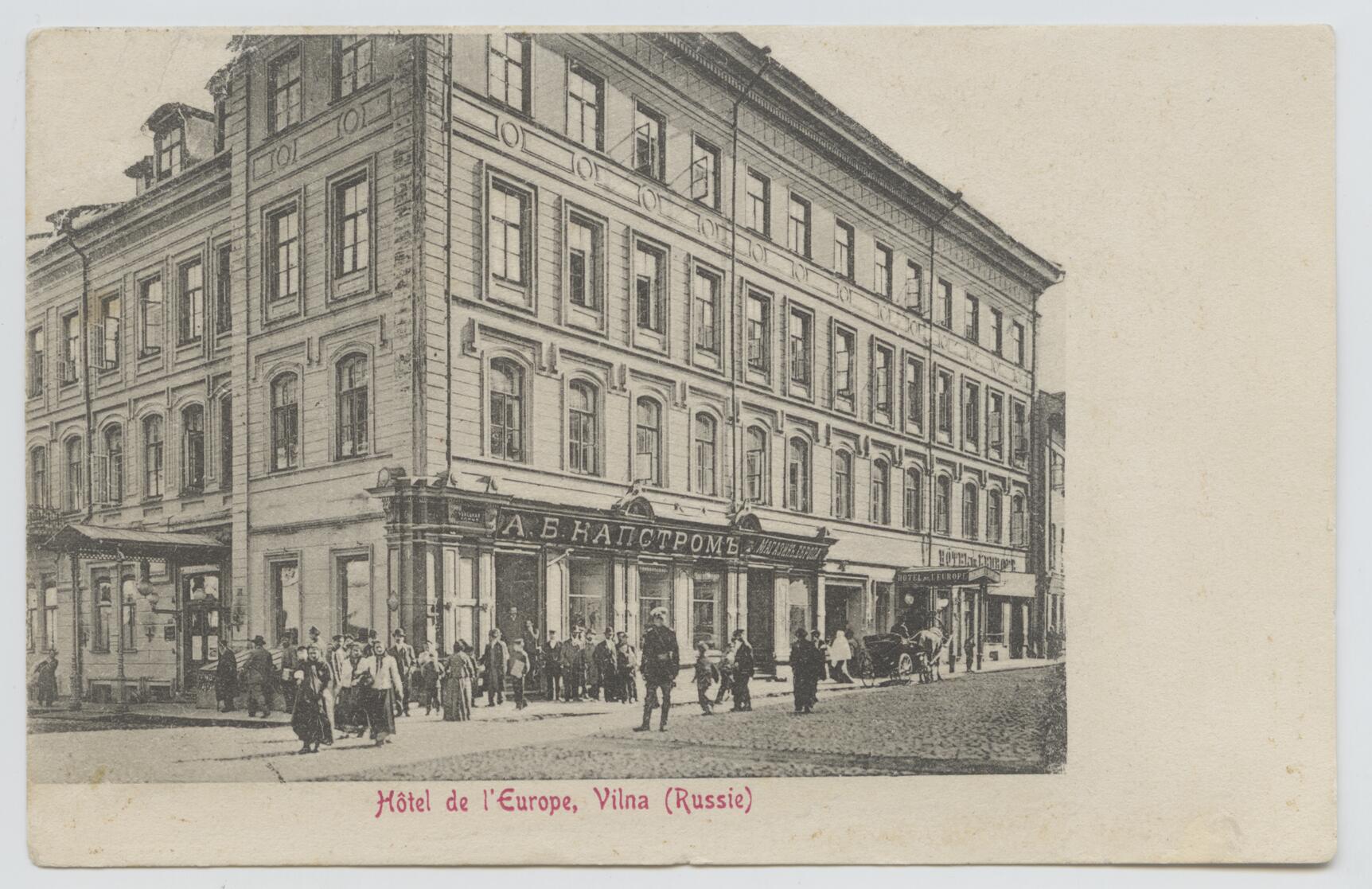 Tačiau turbūt garsiausia čia veikusi įstaiga – 1863 m. duris atvėręs pirmas modernus Vilniaus viešbutis „Europa“. Viešbutyje buvo 50 kambarių, veikė alaus baras ir prancūziškas restoranas. Iki 15 val. čia buvo siūlomi dienos pietūs, o pietų ir vakarienių metu viešbučio restorano klientus džiugino kvartetas. „Europa“ iš kitų Vilniaus viešbučių išsiskyrė tuo, kad aptarnaujantis personalas kalbėjo rusų, lenkų, vokiečių ir prancūzų kalbomis.