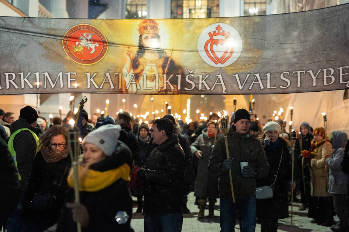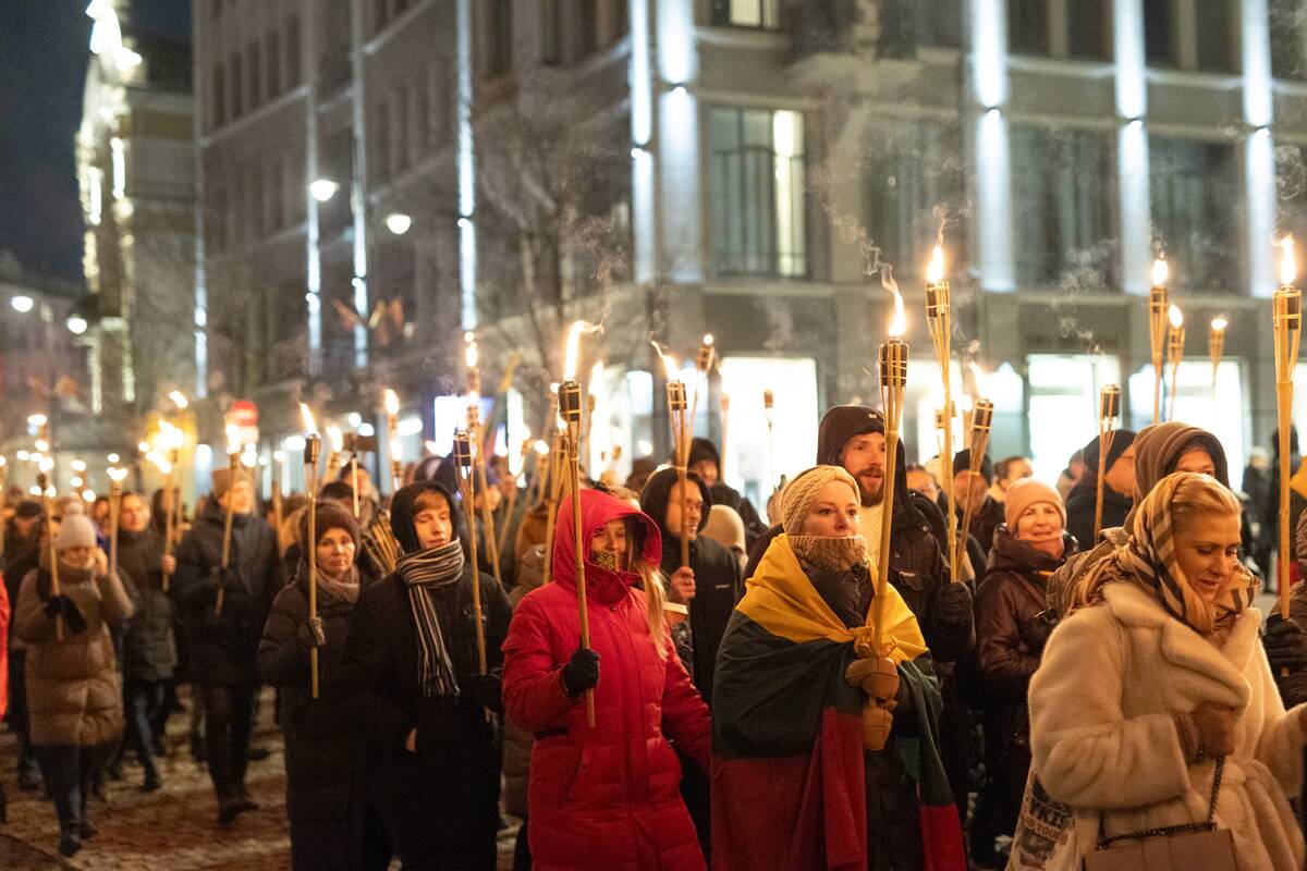 Dauguma jų rankose nešėsi deglus, Lietuvos trispalves, Vyčio vėliavas, buvo pasipuošę tautine simbolika. Žmonės gieda giesmes, o prieš eiseną pasimeldė.