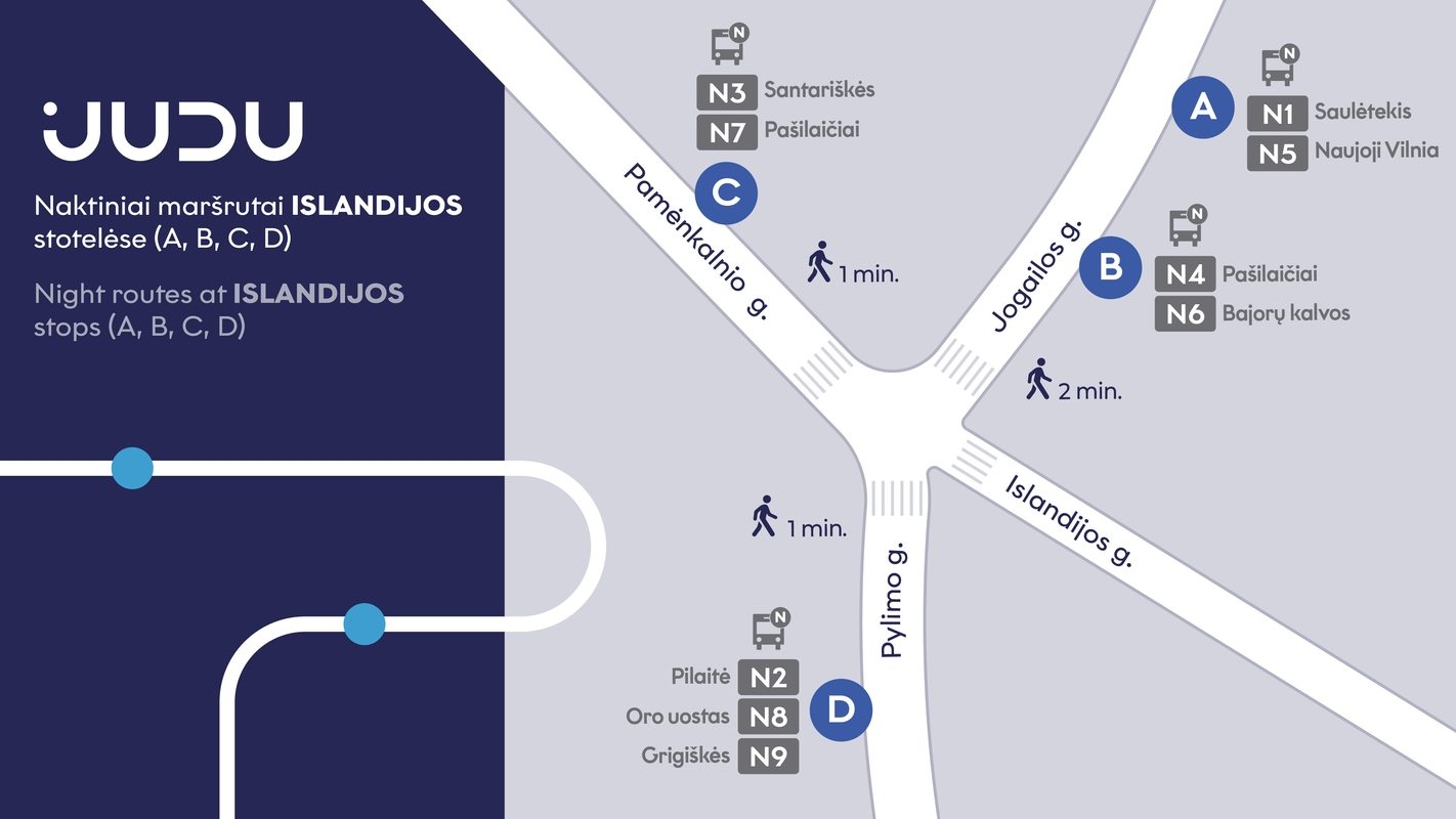 „Tai – pirmas kartas Vilniaus istorijoje, kai naktiniai maršrutai suorganizuoti „susitikimo“ principu – visi autobusai atvyksta į tą patį mazgą tuo pačiu metu ir leidžia sklandžiai persėsti – nelaukiant ilgiau nei 9 minutes. Tokio tipo susitikimo mazgai jau sėkmingai veikia Bratislavoje, Varšuvoje ir Prahoje. Islandijos stotelė tampa Vilniaus atsaku į geriausias Europos naktinio transporto praktikas“, – pasakojo JUDU viešojo transporto organizavimo vadovas Arnas Misiūnas.