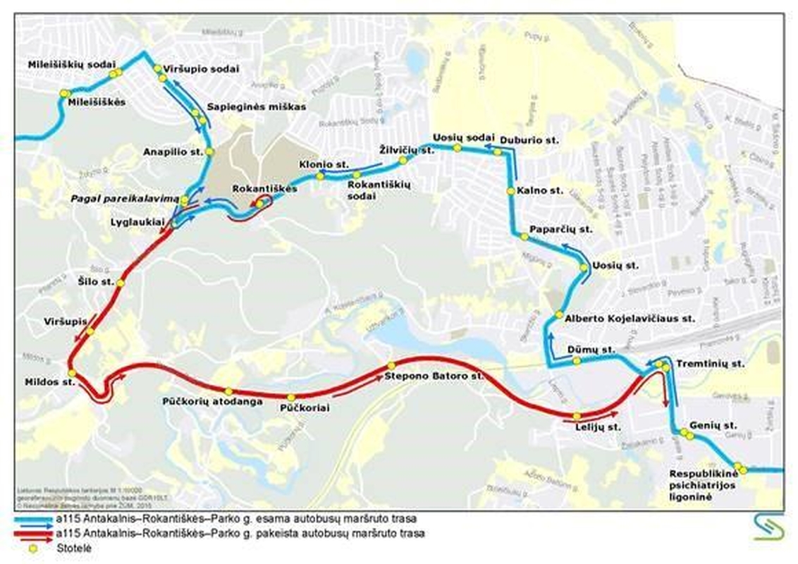 115 maršruto autobusai kursuodami link Naujosios Vilnios važiuos iki stotelės Rokantiškės, kur apsisuks ir toliau važiuos apylanka – Viršupio, Mildos ir S. Batoro gatvėmis, o įvažiavę į Pramonės gatvę grįš į savo trasą. Važiuodami pakeista trasa link Naujosios Vilnios autobusai nestos Klonio, Rokantiškių sodai, Žilvičių, Uosių sodai, Duburio, Kalno, Paparčių, Uosių, Alberto Kojelavičiaus ir Dūmų stotelėse. Kursuodami pakeista trasa link Naujosios Vilnios autobusai papildomai stos stotelėse Lyglaukiai, Šilo, Viršupis, Mildos, Pūčkorių atodanga, Pūčkoriai, Stepono Batoro ir Lelijų. Atgal Antakalnio kryptimi autobusai kursuos įprasta trasa.