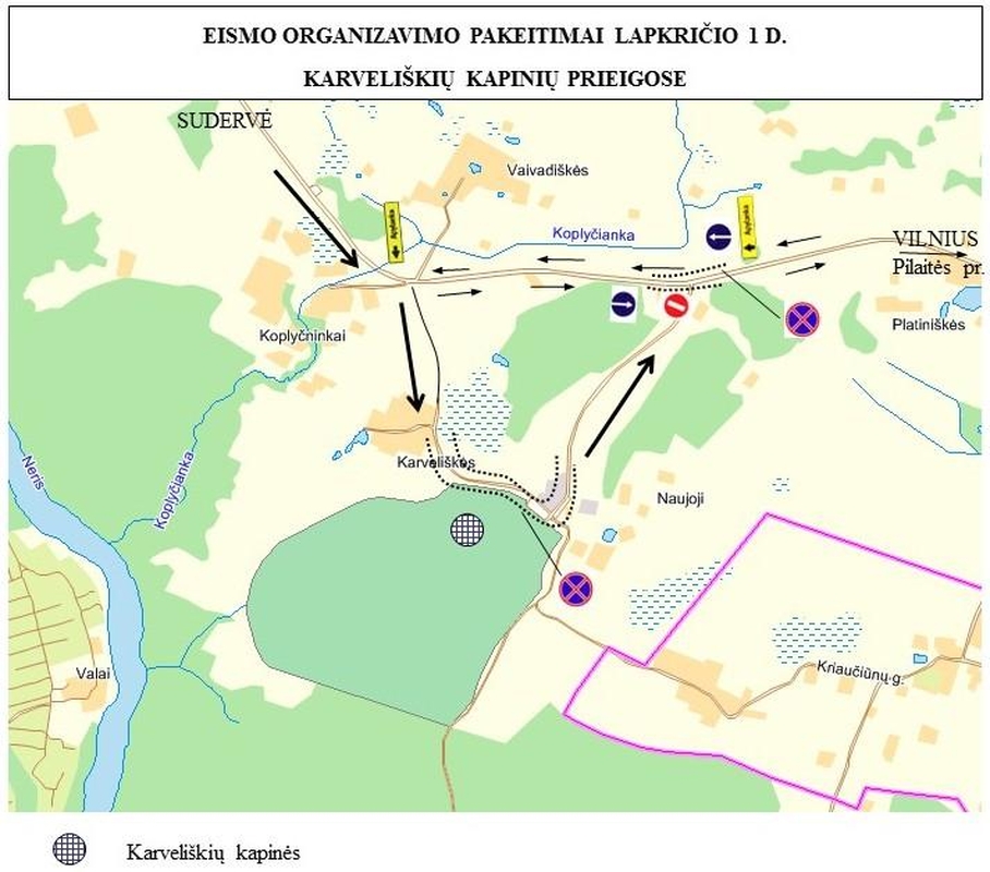 Eismo organizavimas lapkričio 1 dieną keisis ir Karveliškių kapinių prieigose. Vykstantys savo transportu į Karveliškių kapines per Pilaitės rajoną galės privažiuoti prie kapinių ne pagrindiniu, bet aplinkiniu keliu, esančiu už 1 km nuo pagrindinio įvažiavimo, važiuojant link Sudervės. Į Karveliškių kapines rekomenduojama įvažiuoti iš Vilniaus rajono savivaldybės Sudervės seniūnijos pusės. Šias kapines galima pasiekti ir palikus savo automobilį Žvėryno žiede esančioje „Statyk ir važiuok“ aikštelėje bei įsėdus į 63-iojo maršruto autobusą.