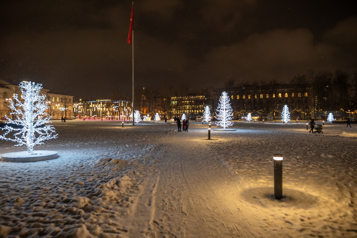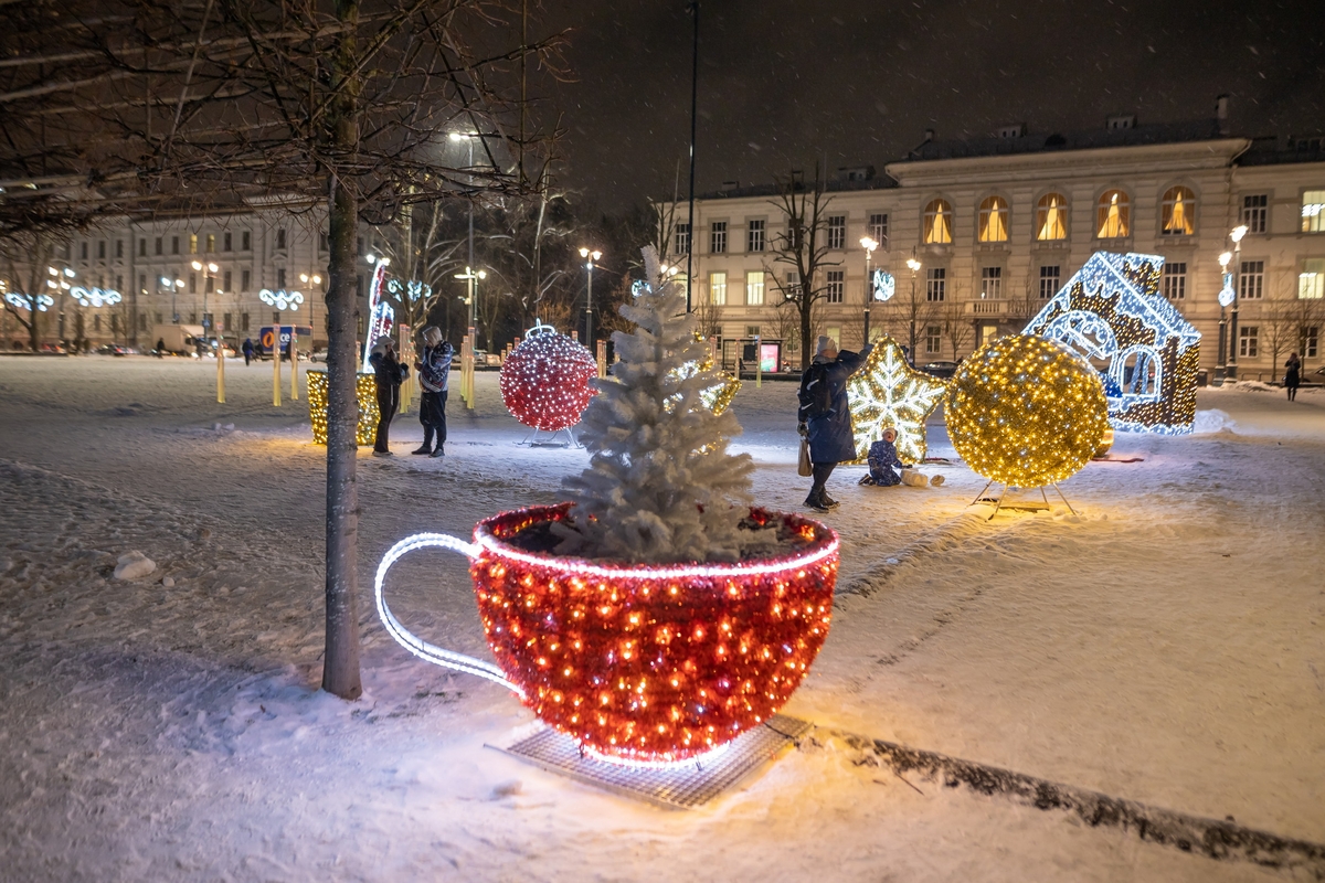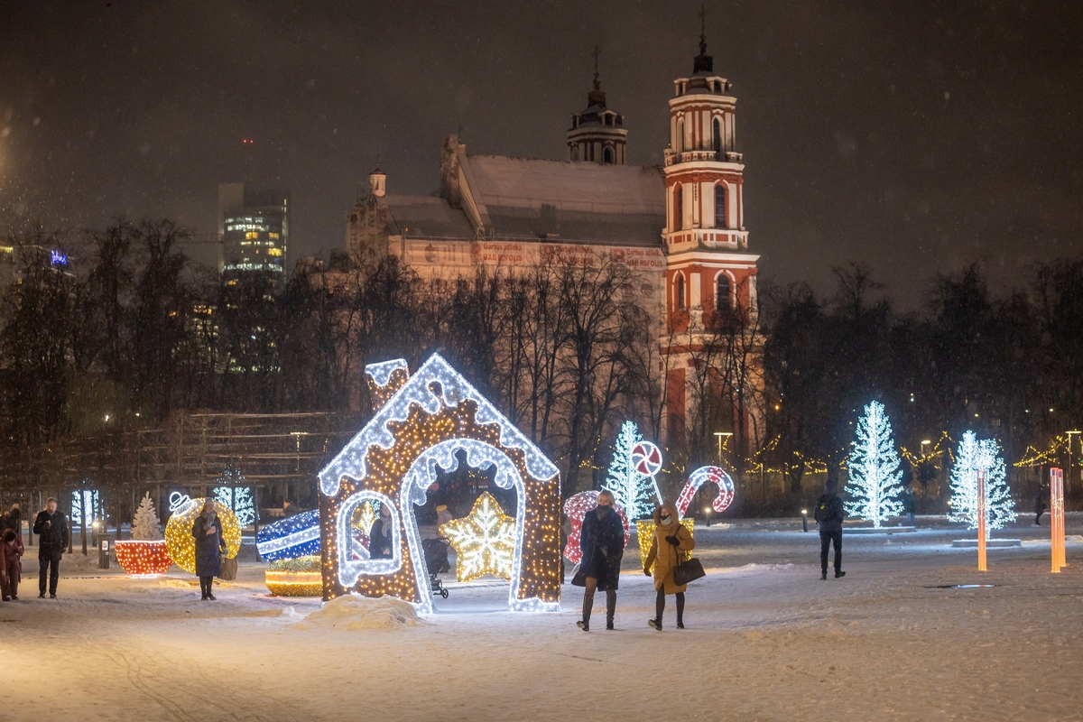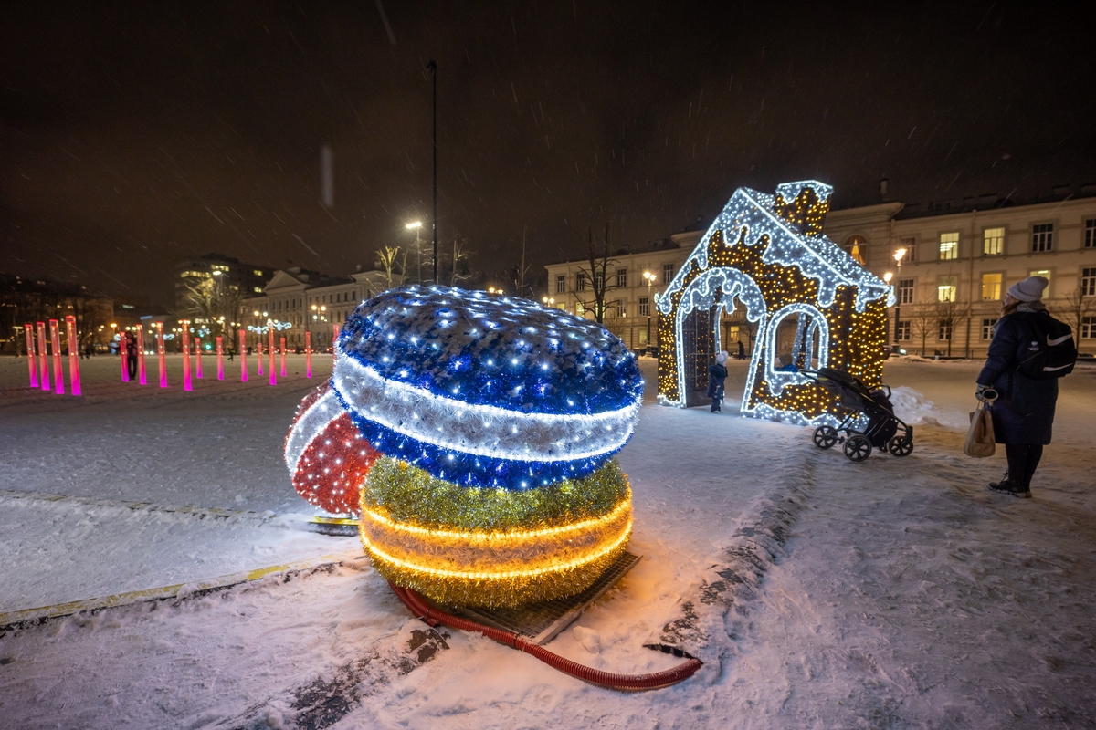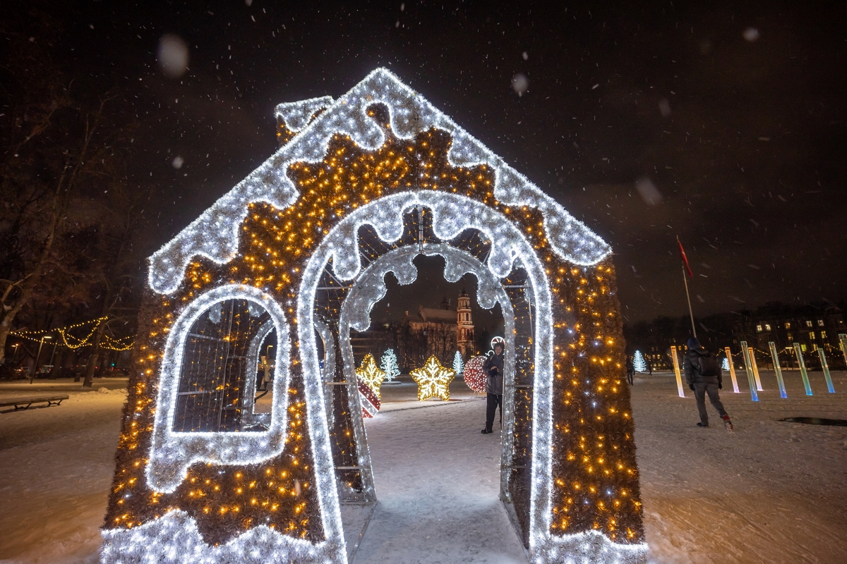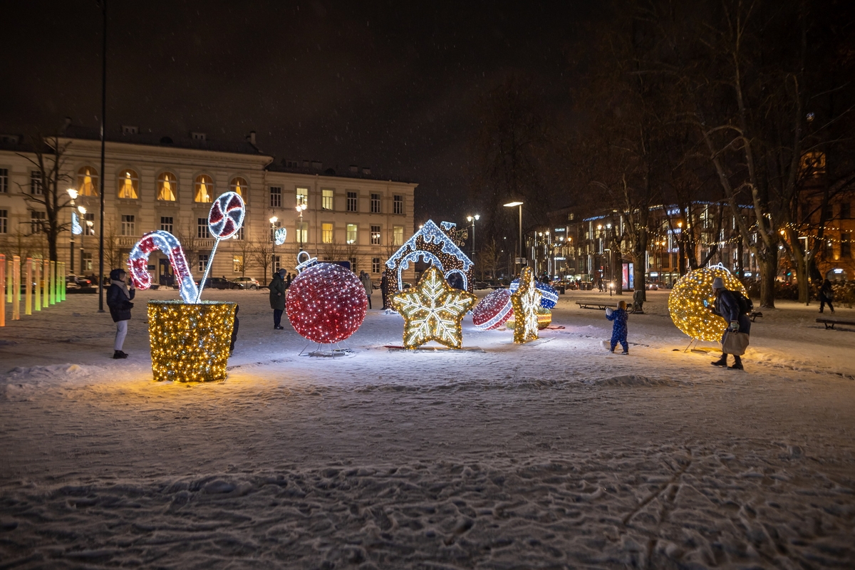 Lukiškių aikštėje veikia trys namukai, prie kurių smagu stabtelėti puodelio karšto šokolado ir kitų gardėsių, pasigrožėti naujomis instaliacijomis – šią žiemą naujai nušviestos aikštės erdvės, alėjos, fontanas ir rojus vaikams – saldumynų miestelis.