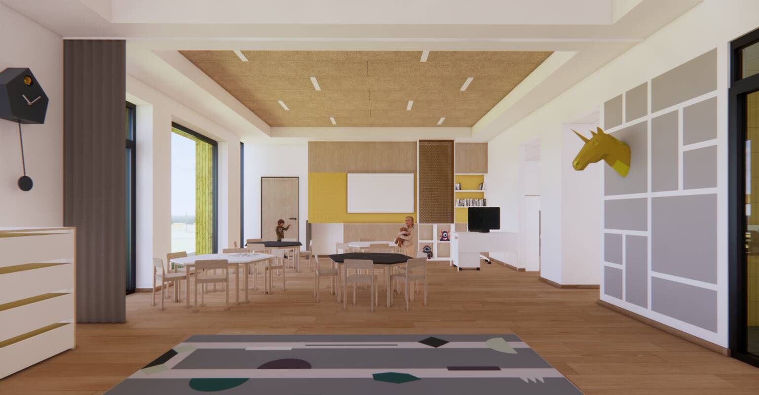 Grupėse suplanuotos priėmimo – nusirengimo erdvės, virtuvėlės, žaidimų ir miego patalpos, kuriose numatyta užuolaida, atskirianti miego zoną nuo aktyvaus ugdymo ir žaidimų zonos. Grupės bus abiejuose pastato aukštuose. Antrajame įsikurs administracijos patalpos, metodinis kabinetas, psichologo, logopedo ir papildomo ugdymo kabinetai. Rūsyje bus įrengtos patalpos, skirtos inžinerinėms sistemoms ir baseino įrangai.